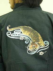 猛々しい虎と優雅な花の特製立体バックプリントです。紐・襟部分には和柄生地・ 百花繚乱柄をあしらっております。猛々しい虎と優雅な花を配した、華やかであり男らしくもある、秘蔵の作務衣です。