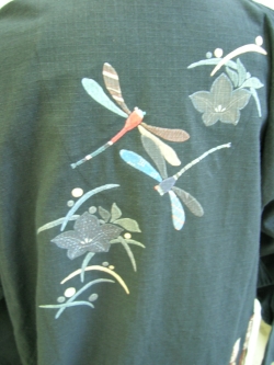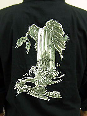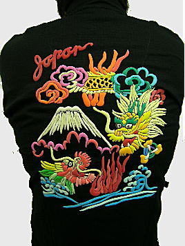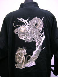 この作務衣のバックプリントは、2頭の龍、荒れ狂う大河と業火、なかなか迫力あるデザインです。