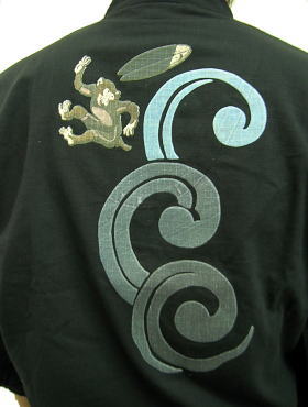 ら・さらモンキーがサーフィンに乗る特製立体バックプリントです。紐・襟部分には和柄生地・ 歌舞伎柄をあしらっております。